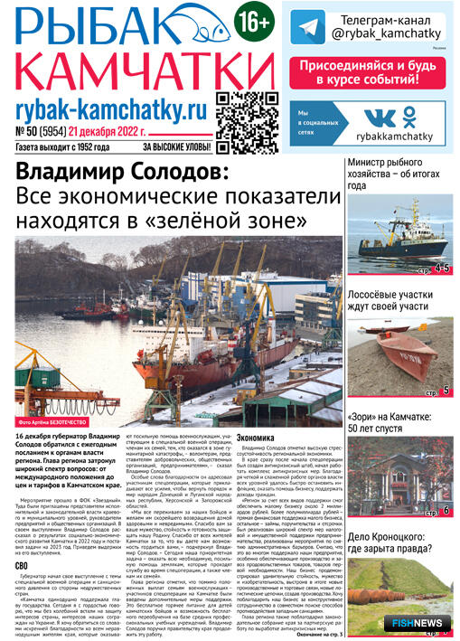 Обзор газеты «Рыбак Камчатки»Выпуск № 50 от 21 декабря 2022 г. |