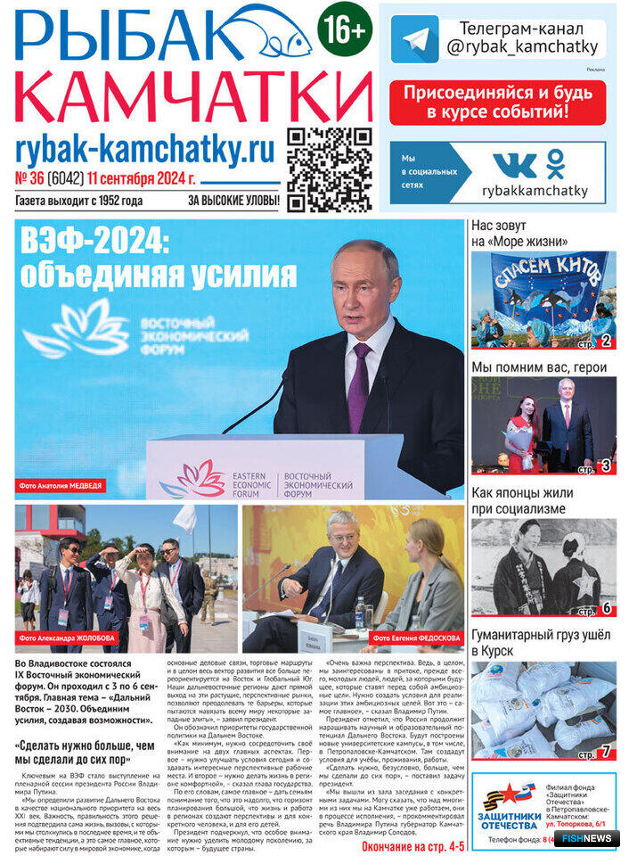 Свежий номер «Рыбака Камчатки» посвящён IX Восточному экономическому форуму, который проходил во Владивостоке с 3 по 6 сентября.