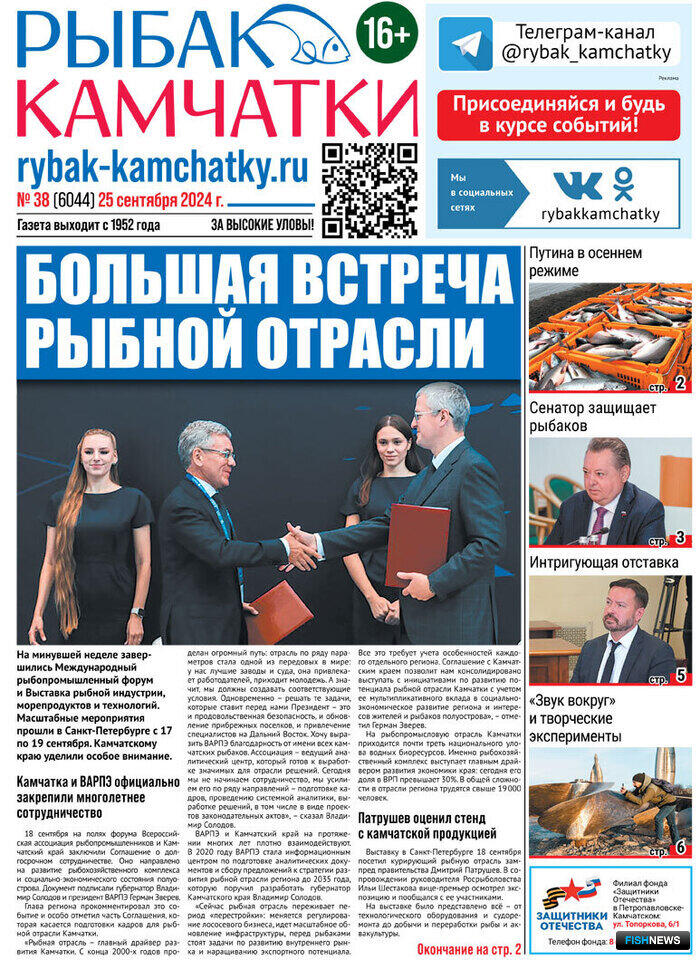 Обзор газеты «Рыбак Камчатки»Выпуск № 38 от 25 сентября 2024 г. |