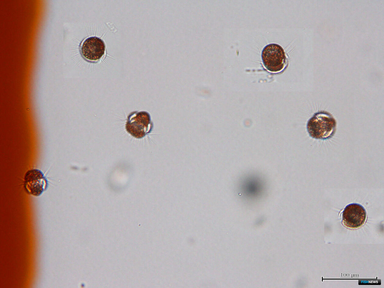 Как рассказала заведующая лабораторией рыбохозяйственной экологии Екатерина Лепская, изучение проб под микроскопом показало: причиной покраснения воды стала инфузория мерионекта (Merionectarubra, она же Mesodiniumrubrum), которая живет в симбиозе с окрашенными в пурпурный цвет криптомонадами — криптофитовыми одноклеточными водорослями.