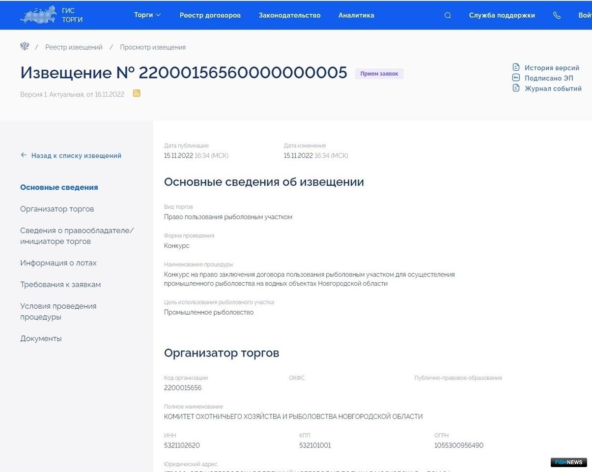 В Новгородской области объявлен конкурс на семь озерных участков для промышленного рыболовства. Заявки принимаются до 12 января — дня вскрытия конвертов с предложениями