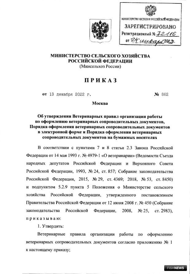 Новые правила ветеринарной сертификации утверждены приказом Минсельхоза от 13 декабря 2022 г. № 862. Документ опубликован на Официальном интернет-портале правовой информации, сообщает корреспондент Fishnews.