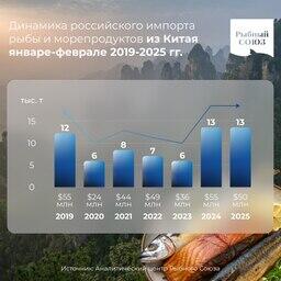 За первые два месяца 2025 г. из Китая в Россию отправилось 13 тыс. тонн рыбопродукции на 50 млн долларов. По сравнению с уровнем прошлого года в натуральном выражении импорт снизился на 2%, а в стоимостном - на 10%, подсчитал аналитический центр Рыбного союза на основе данных Главного таможенного управления КНР.
