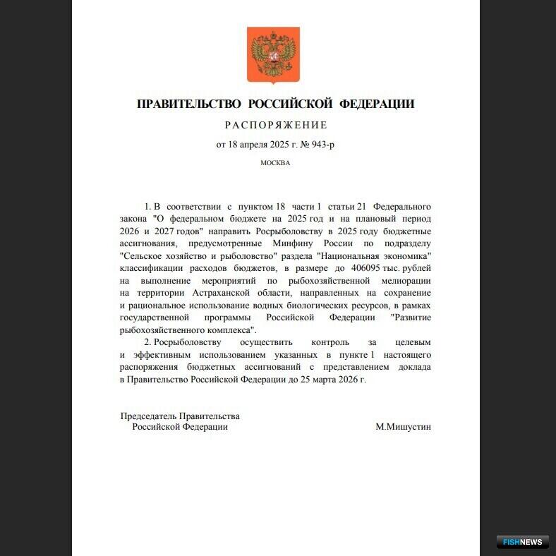 Согласно распоряжению кабмина от 18 апреля 2025 г. № 943, средства будут направлены Росрыболовству.
