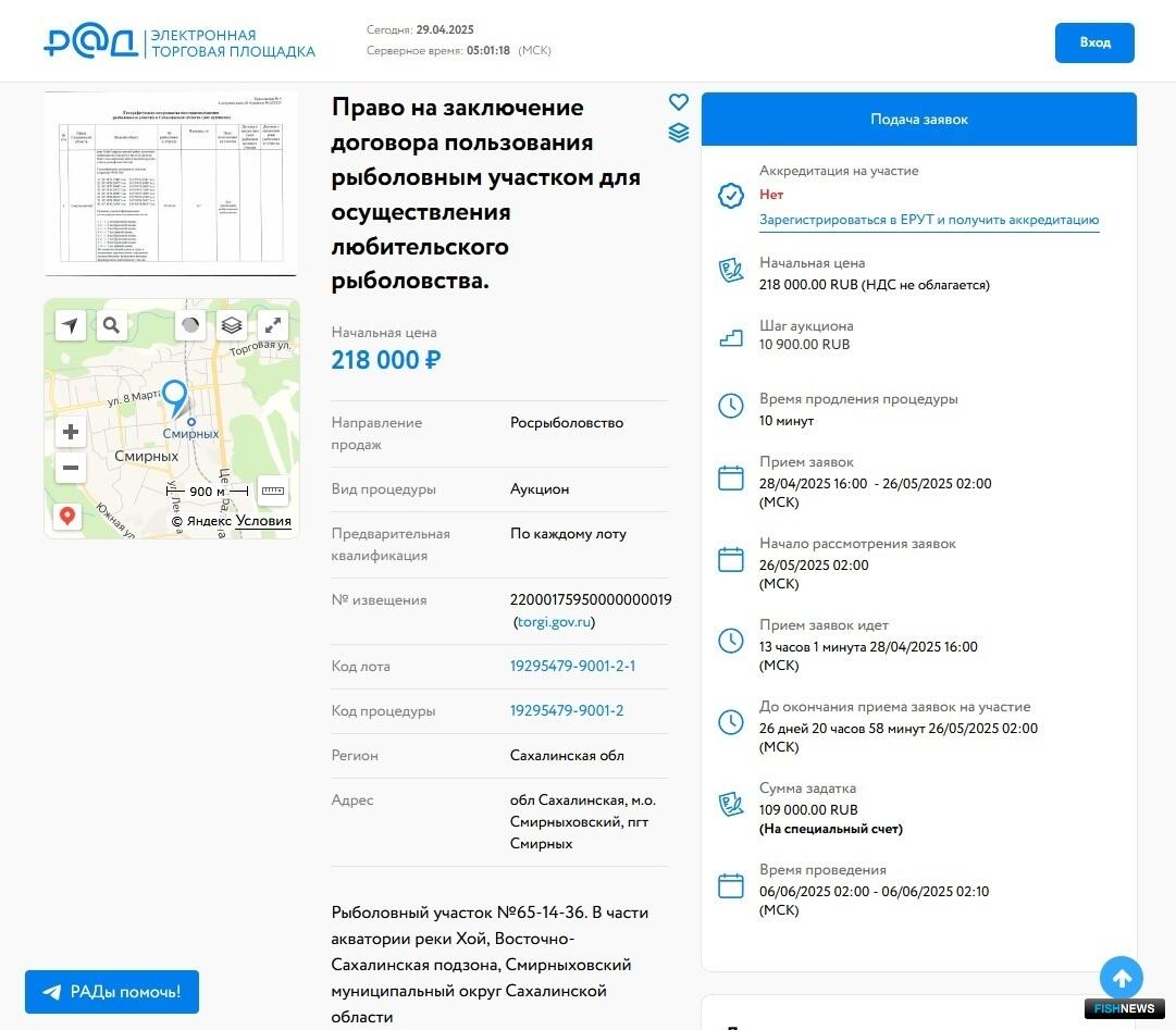 Напомним, что на другом электронном аукционе предполагается подобрать пользователя еще одному рыболовному участку для лицензионного лова — на реке Пильво (тоже в Смирныховском районе).