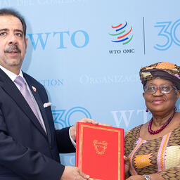 Посол Бахрейна Абдулла Абдуллатиф Абдулла на официальной церемонии вручил документ генеральному директору ВТО Нгози Оконджо-Ивеале.