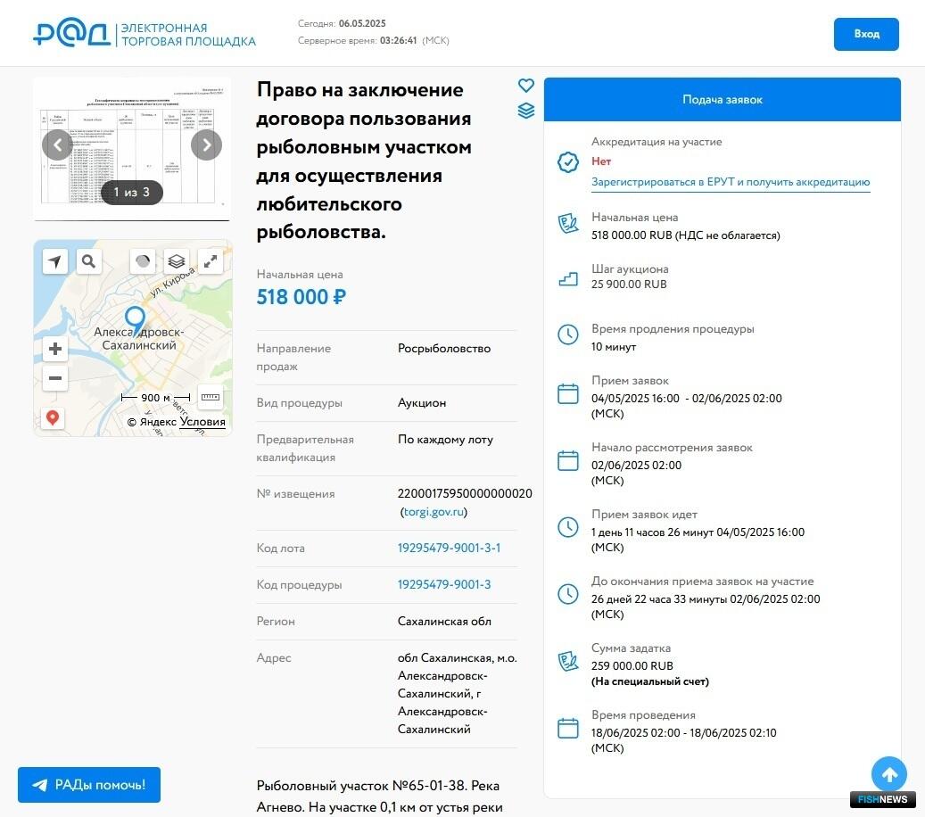 Прием заявок на участие в электронном аукционе открылся 4 мая и завершится 2 июня. Начало самих торгов запланировано на 18 июня, сообщает корреспондент Fishnews.