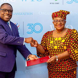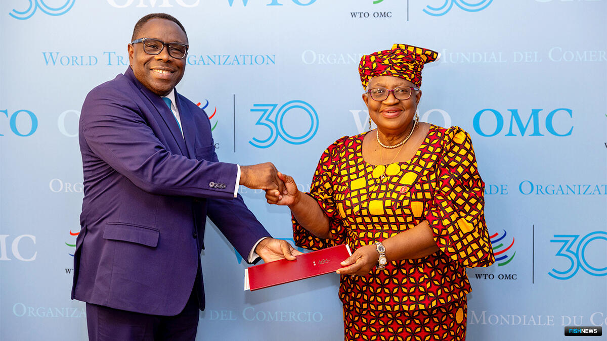Посол Ганы Эммануэль Кваме Асиеду Антви передал документ о присоединении к соглашению ВТО по субсидиям в области рыболовства генеральному директору организации Нгози Оконджо-Ивеале.