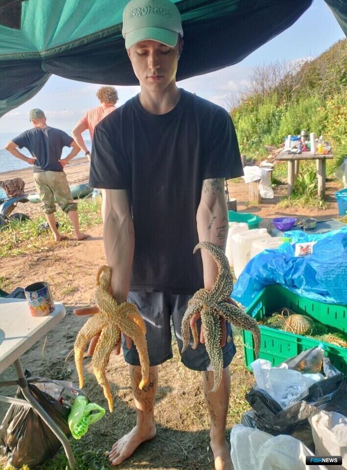 Был выполнен учет и морфометрический анализ сопутствующих видов гидробионтов, основную массу которых составляли морские звезды Asterias amurensis, Patiria pectinifera, Distolasterias nipon, Aphelasterias japonica и другие.