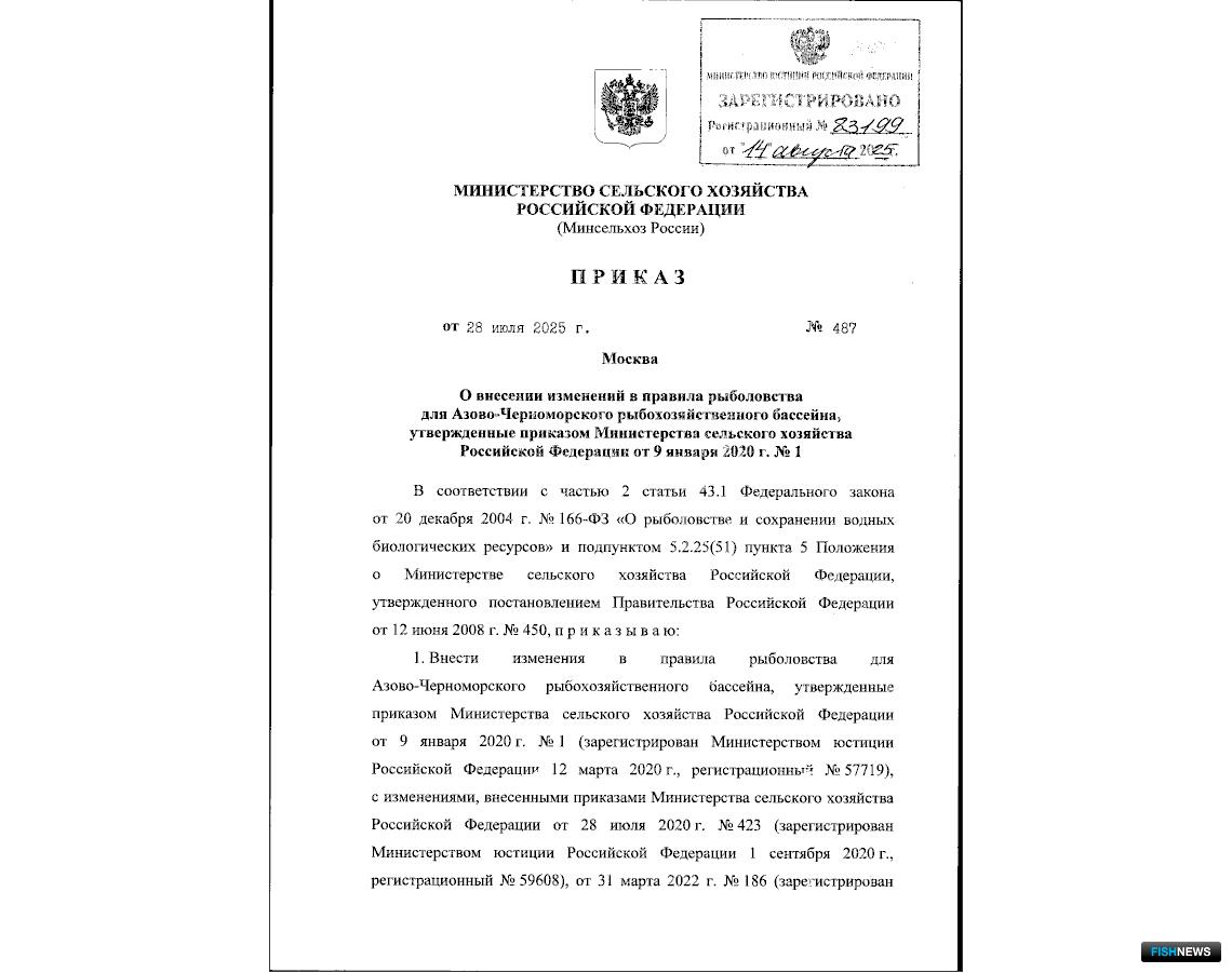 Изменения в правила рыболовства для Азово-Черноморского бассейна внесеныприказом Минсельхоза России от 28 июля 2025 г. № 487, сообщает корреспондент Fishnews.