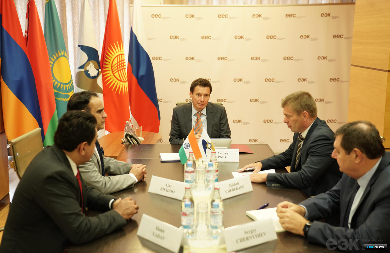 Министр по торговле Евразийской экономической комиссии Андрей Слепнев принял руководителей переговорных групп по заключению соглашения о свободной торговле между ЕАЭС и Республикой Индия — заместителя директора департамента торговой политики ЕЭК Михаила Черекаева и дополнительного секретаря департамента коммерции при Министерстве торговли и промышленности Индии Шри Аджая Баду.