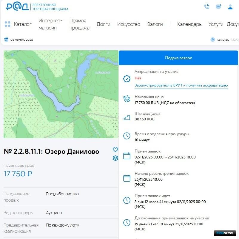 На торги в электронном формате выставили участок для организации любительской рыбалки на озере Данилово в Архангельской области. Аукцион запланирован на 8 декабря.