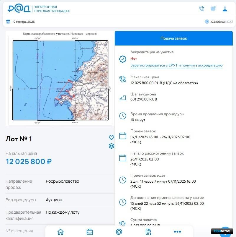 Как сообщает корреспондент Fishnews, начальная цена рыболовного участка на реке Имповеем составляет около 12 млн рублей, на реке Тополовка — почти 6,5 млн рублей. РЛУ на реке Уйкан оценен в 8,3 млн рублей.