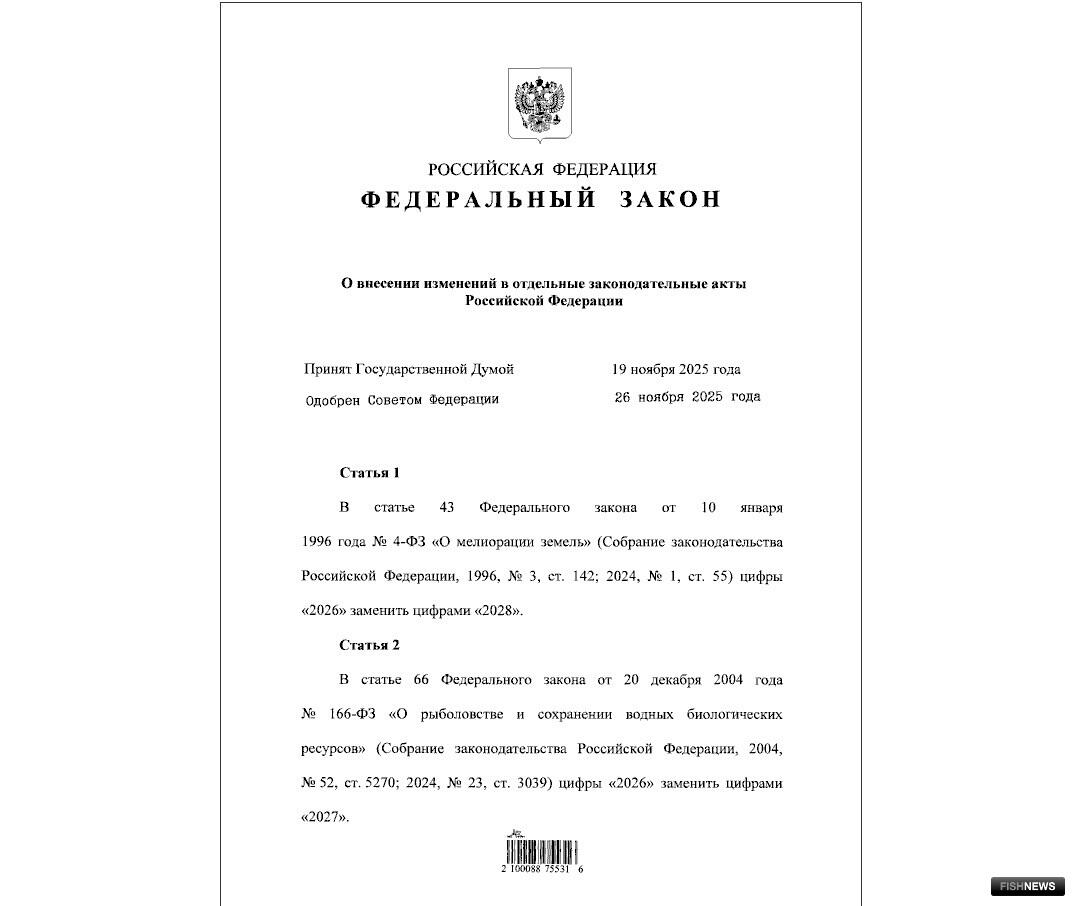 Президент подписал закон, позволяющий пользователям водных биоресурсов Азовского и Черного морей вести рыболовный журнал в бумажном формате до конца 2026 г. Изменения помогут предприятиям продолжить работу.
