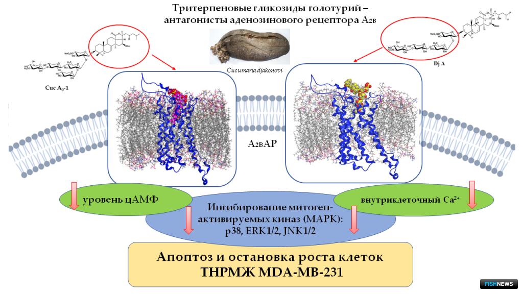 Эксперименты проводились на клетках тройного негативного рака молочной железы человека (ТНРМЖ) — агрессивной формы рака груди. Ученые установили, что природные соединения кукумариозид A0-1 и дьяконовиозид A (тритерпеновые гликозиды), добытые из голотурий, блокируют аденозиновый рецептор A2B (A2BAR). Во многих раковых клетках этот рецептор вырабатывается слишком активно, из-за чего чаще образовываются метастазы. Авторы исследования впервые показали, что именно этот рецептор является мишенью для гликозидов голотурий.