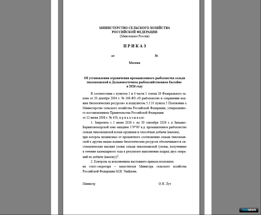 В 2026 г. планируется вновь ввести ограничение на специализированный промысел сельди в Западно-Беринговоморской зоне. Проект приказа с такой мерой опубликовало Министерство сельского хозяйства.