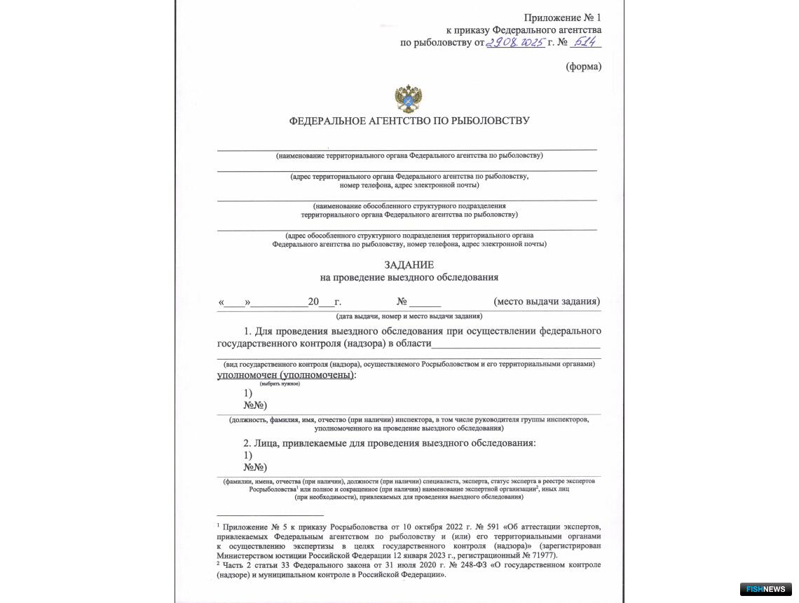 Формы документов для государственного контроля (надзора) Росрыболовство утвердило приказом от 29 августа 2025 г. № 514. Правовой акт опубликовали 21 января.